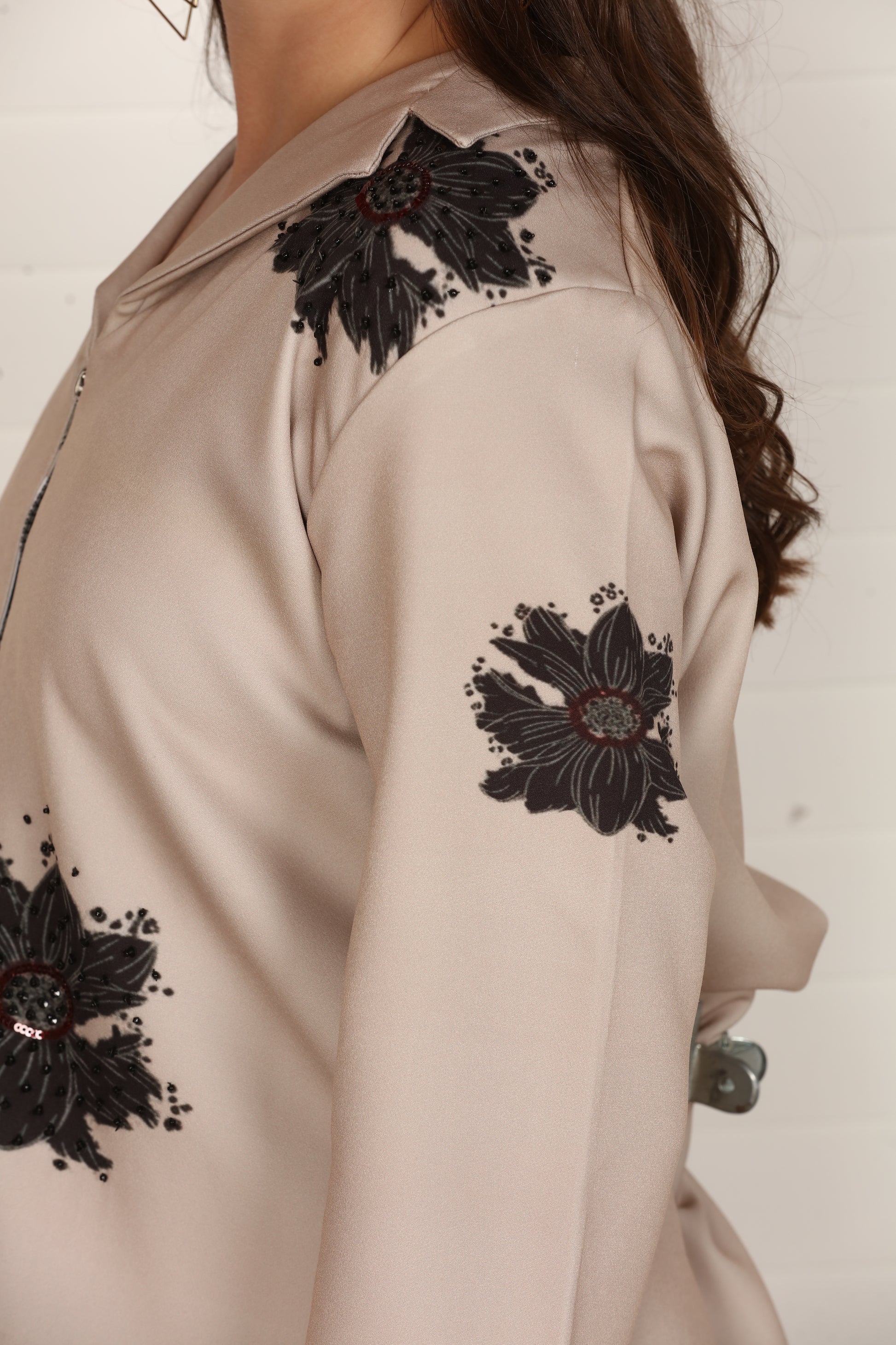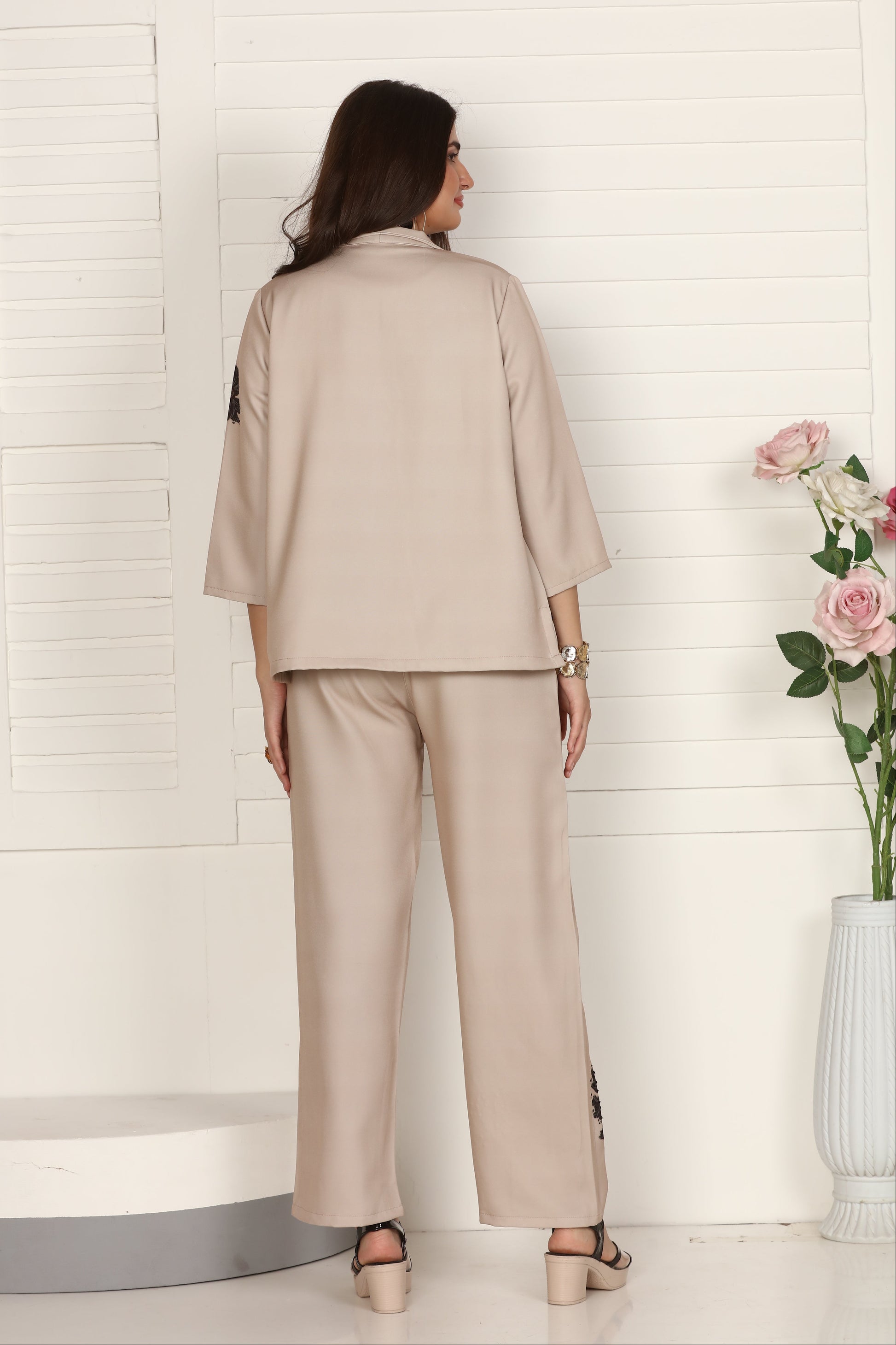 A sophisticated beige co-ord set featuring a structured zip-front top and straight-fit pants with minimal floral accents.